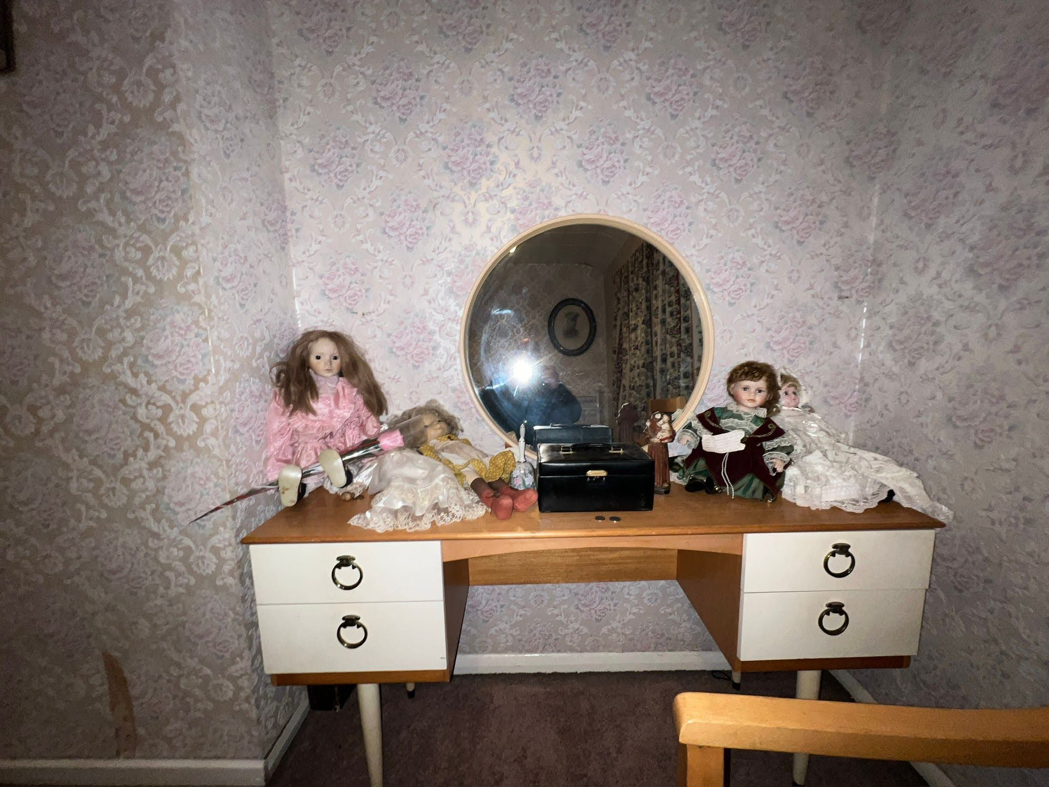 The bathroom, the room next to this (Diane’s Room) reputedly to be the most haunted bedroom in Europe, next to this is the Pritchard’s bedroom with very scary china dolls, and next to that the box room full of baby’s toys. We set up an array of cat balls that light up if touched, EMF meters that measure electromagnetic currents and an infra-red trail camera that can pick up movement and film, even in pitch darkness.